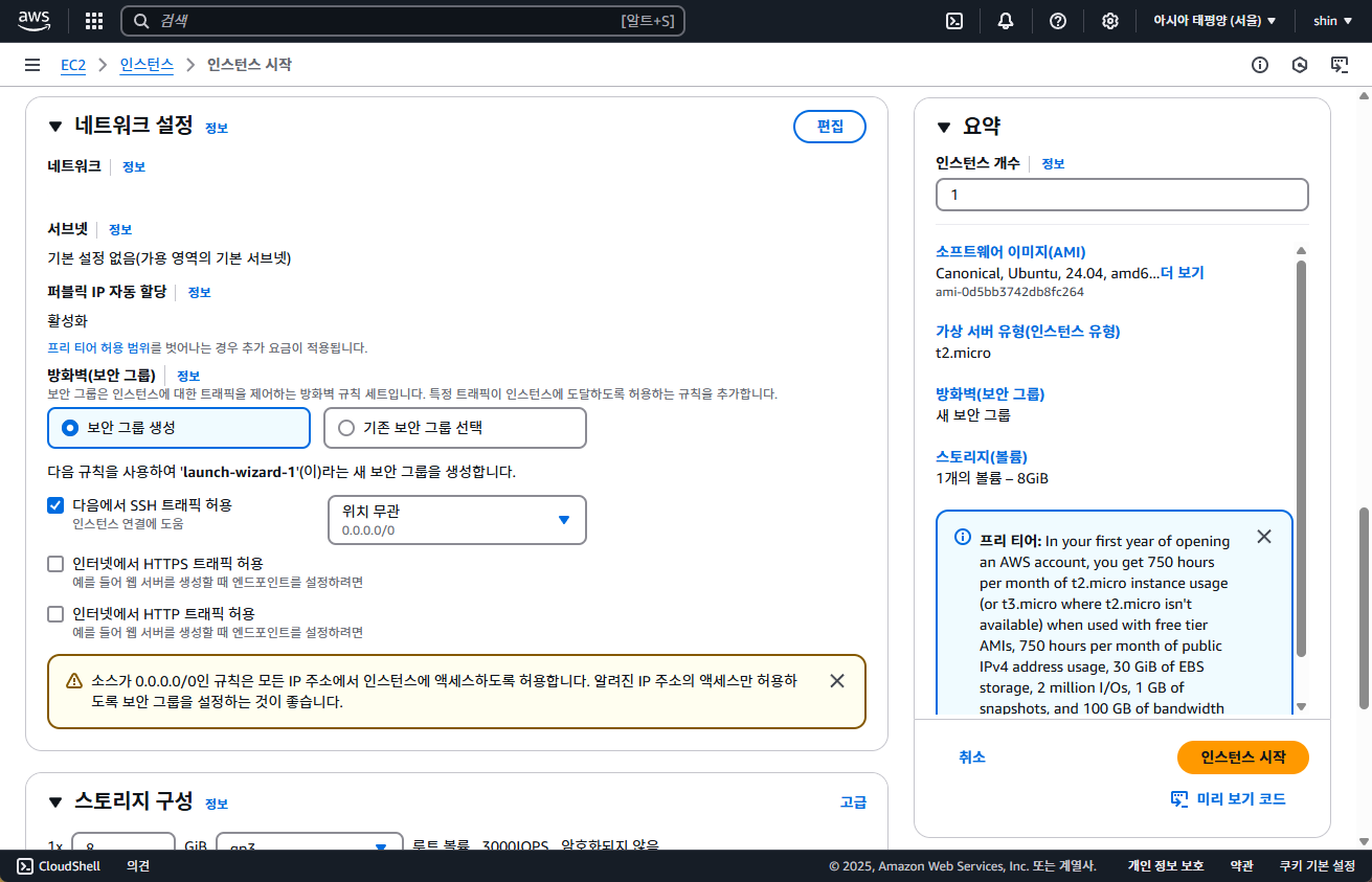 스토리지 구성까지 끝났다면 화면 우측의 요약화면에 있는 인스턴스 시작 버튼을 눌러주세요.