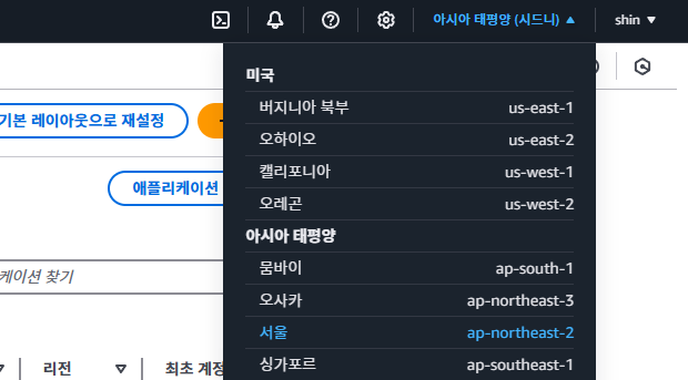 리전은 AWS 화면에서 우측 상단 설정 옆에서 변경할 수 있습니다.