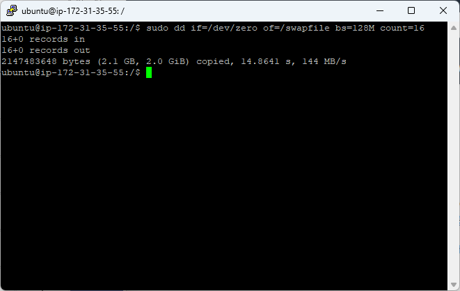 $ sudo dd if=/dev/zero of=/swapfile bs=128M count=16