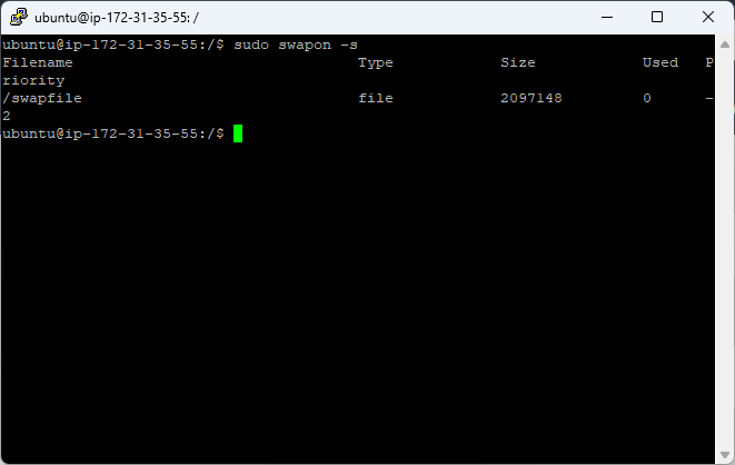 swapon -s을 통해서 스왑 영역이 적용된 것을 확인할 수 있습니다.