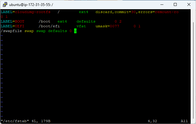 /etc/fstab에는 다른 설정 라인이 있기 때문에 가장 마지막 줄에 /swapfile 을 작성해주시면 됩니다.