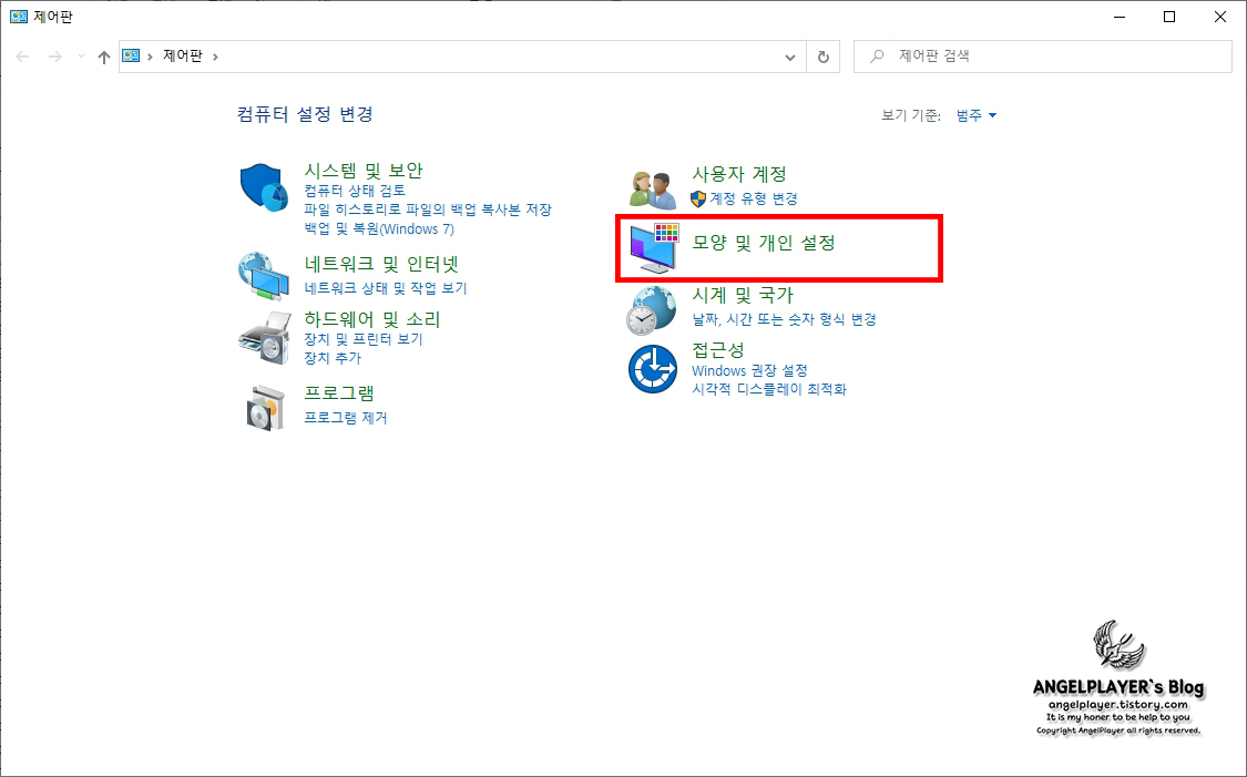 다음 제어판으로 들어가셔서 [모양 및 개인 설정]을 클릭합니다.