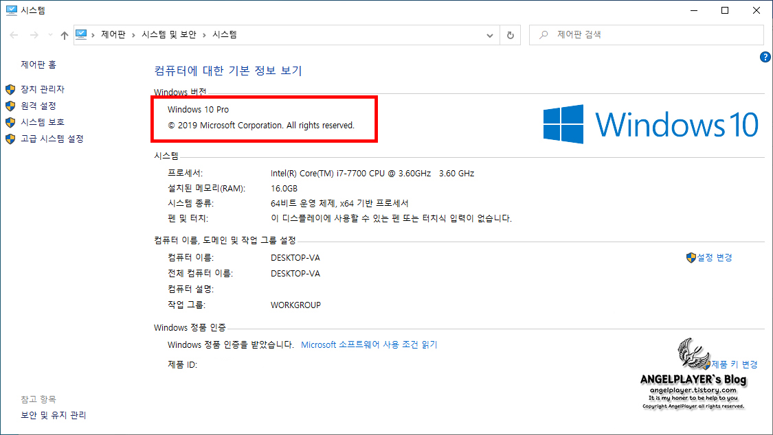 위에서 구매한 윈도우 10 Pro버전이 제대로 설치된 모습을 확인할 수 있습니다.