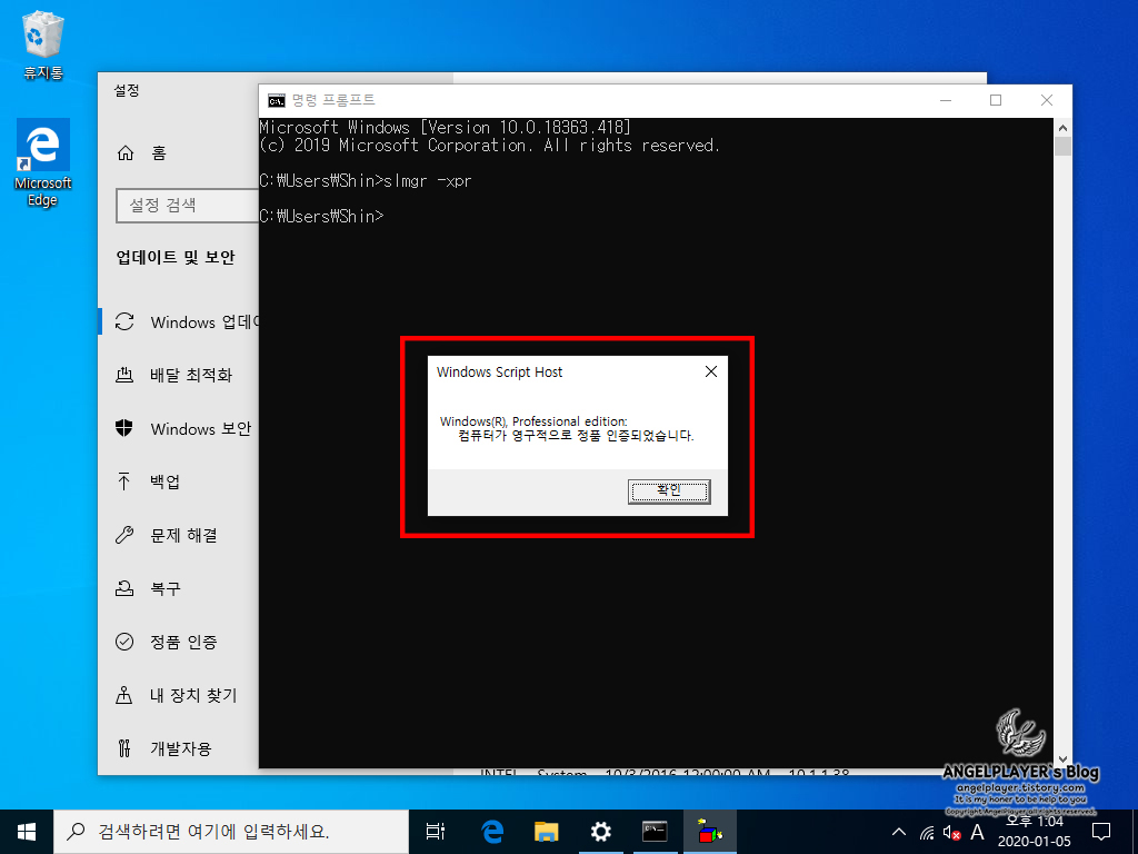 CMD를 통해서 컴퓨터에 정품인증이 되었다는 문구도 확인할 수 있습니다.