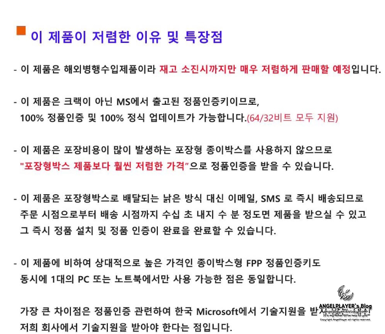 기타 내역은 MS 홈페이지에서 구매하는 윈도우 정품과 거의 유사한데요, 이미지 중간에 나와있는 '가장 큰 차이점은 정품인증과 관련하여 한국 Microsoft에서 기술지원을 받지 않는 대신 저희 회사에서 기술지원을 받아야 한다는 점입니다.' 부분이 다릅니다.