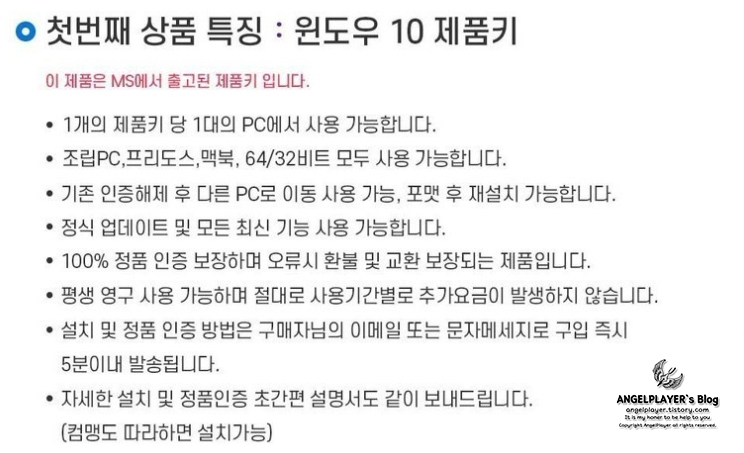 한 오픈마켓에서 윈도우 정품에 대한 설명을 보기 위해서 간단히 일부만 캡처하여 왔습니다.