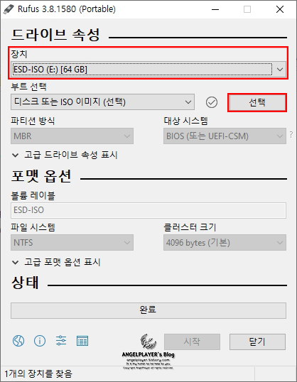 우선 [장치] 탭에서 부팅 USB로 제작 할 원하는 USB가 맞는지 다시 한 번 확인해주세요!