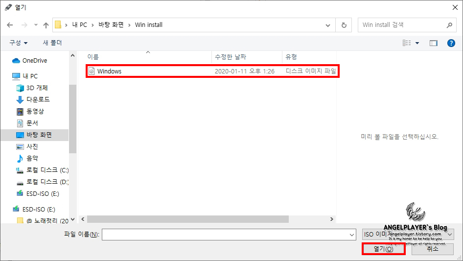 제작을 할 ISO파일이 있는 경로로 들어가 Windows.iso파일을 선택 후 [열기]를 눌러줍니다.