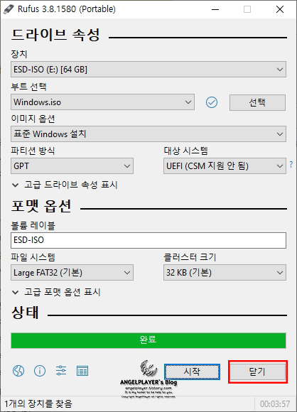 [닫기]를 눌러 Rufus 프로그램을 종료시켜주세요!