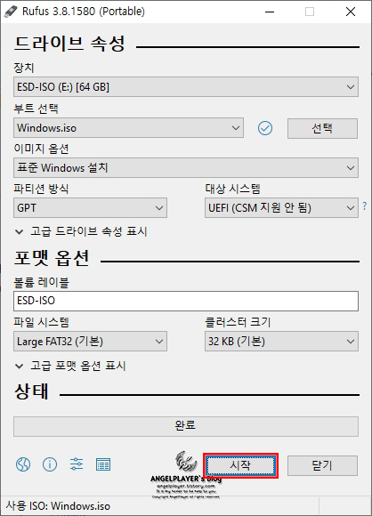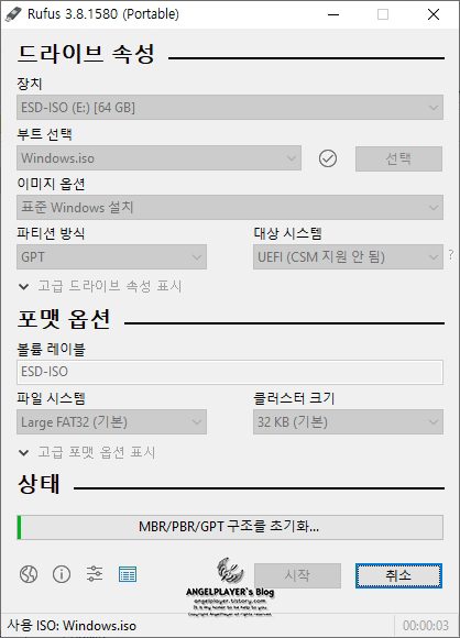 <윈도우 Ver.1909, Rufus Ver.3.8.1580를 이용하여 작성하였습니다.>