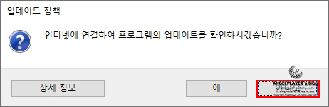 업데이트 확인 창이 뜨면 방금 공식 홈페이지에서 최신 버전을 다운 받았기 때문에 [아니오]를 눌러줍니다.