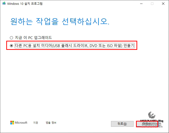 [작업 선택] 탭에서 [다른 PC용 설치 미디어(USB 플래시 드라이브, DVD 또는 ISO 파일) 만들기]를 선택한 후 [다음]으로 넘어갑니다.