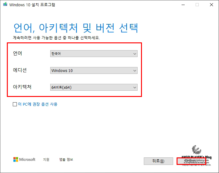 [언어, 아키텍처] 탭에서는 각각 한국어, Windows 10, 64bit(별도로 32bit를 이용하실 분은 변경)를 선택 후 [다음]으로 넘어갑니다.