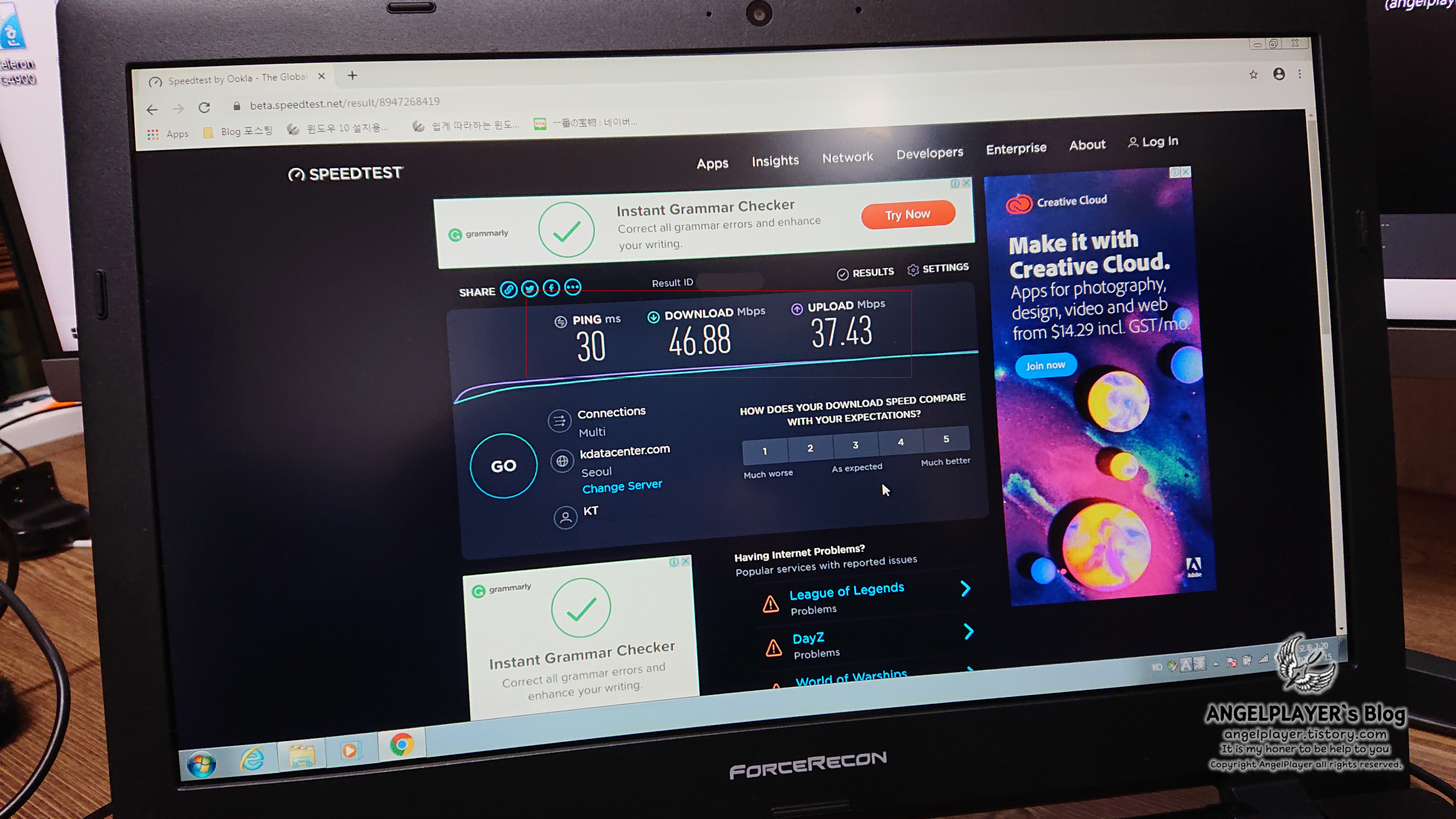 다운로드 46.88MB, 업로드 37.43MB의 속도를 보여주었습니다.