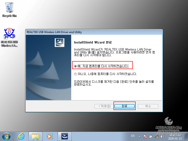 설치가 완료되면 [재시작]을 선택한 후 [완료]를 눌러줍니다.