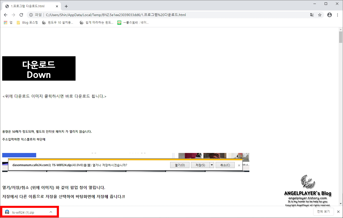 1번 파일을 열면 위와 같은 화면이 나오는데요. 화면 상단에 까만 바탕의 [다운로드 Down] 버튼을 누르면 방금 받았던 압축파일과 동일한 이름의 압축파일이 하나 더 다운로드됩니다.