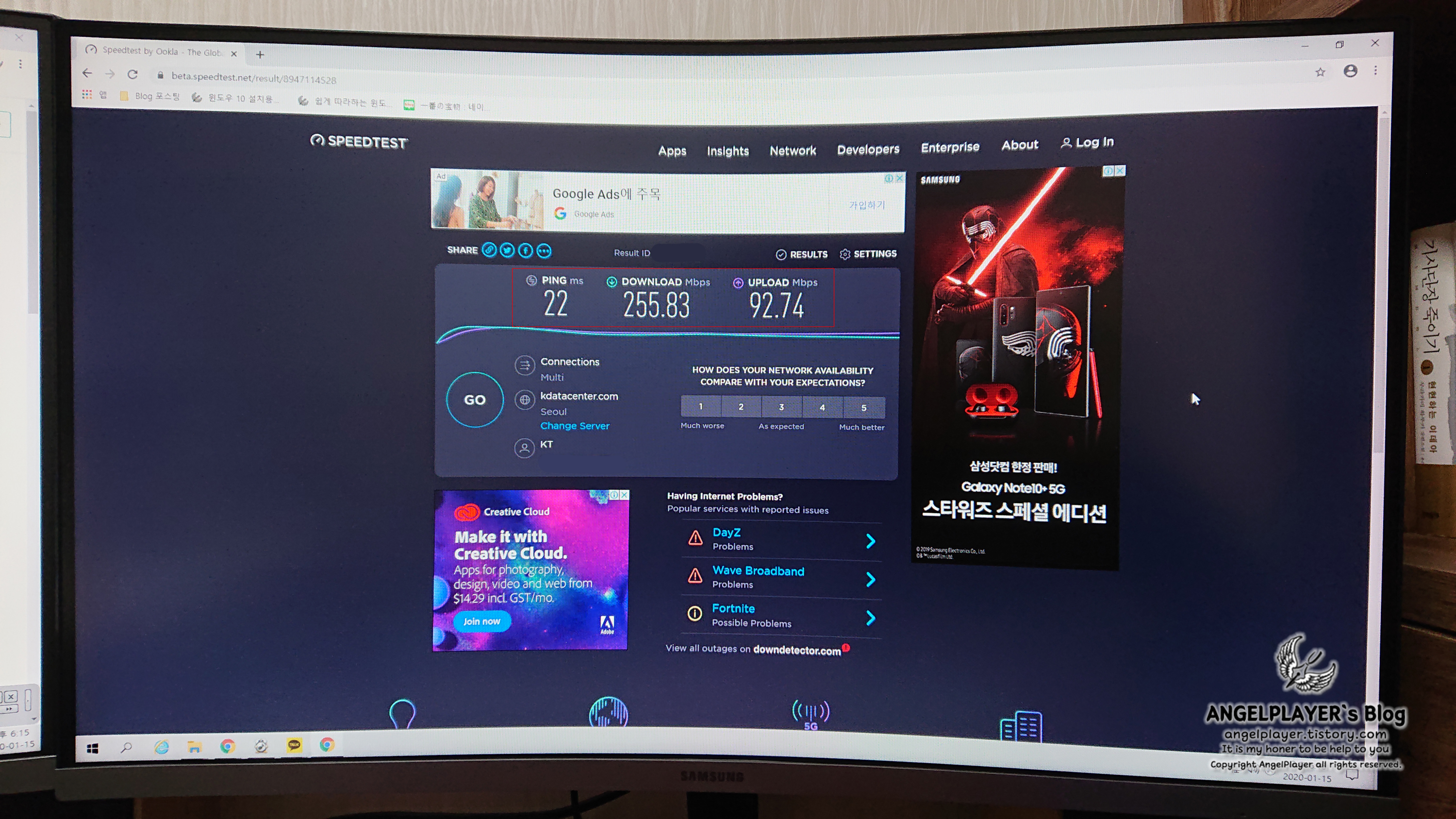데스크탑에서 유선으로 연결 후 진행하였을 때 다운로드 255.83, 업로드 92.74의 속도를 보여주었습니다.